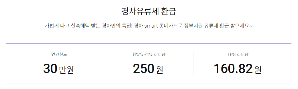 경차 Smart 롯데카드는 유류세 환급 서비스와 카드 발급 후 초기 할인 혜택이 포함되어 있습니다.