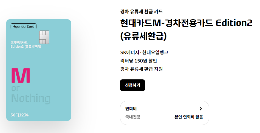 현대카드M-경차전용카드 Edition2 카드는 주유소에서의 할인과 유류세 환급 지원이 포함되어 있습니다.