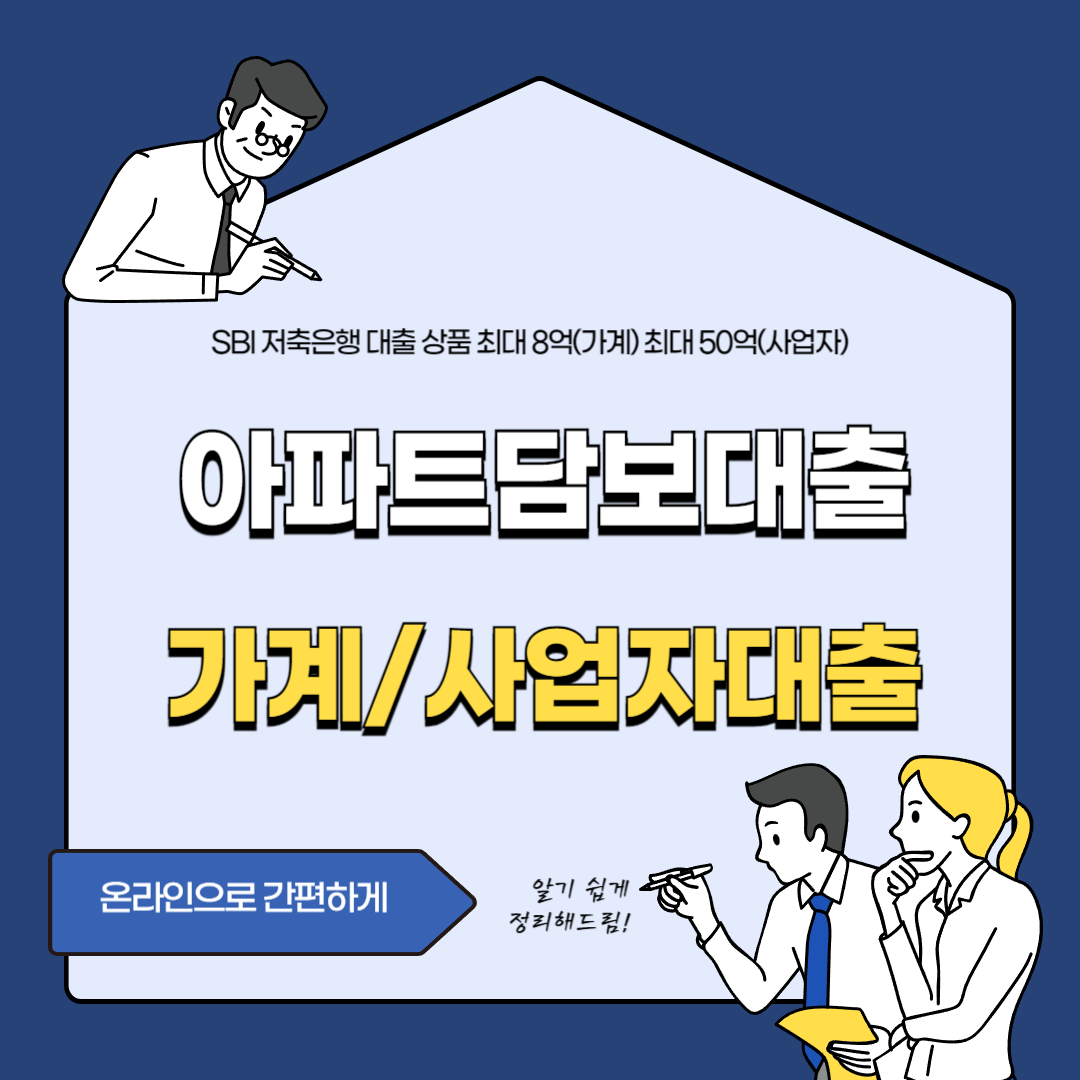 SBI 저축은행은 아파트 담보 대출 상품을 제공하고 있습니다. 이 상품은 최대 95%의 대출 한도와 6% 대부터 시작하는 금리로 이용할 수 있습니다. 또한 서류 제출과 대출 신청을 온라인으로 간편하게 하실 수 있습니다. 한도는 최대 50억까지 가능하다고 하니 확인해 보시기 바랍니다.