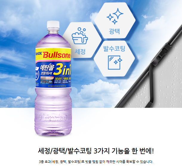불스원 레인OK 에탄올은 세정력·광택·발수 코팅을 한 번에 구현한 3in1 구조입니다