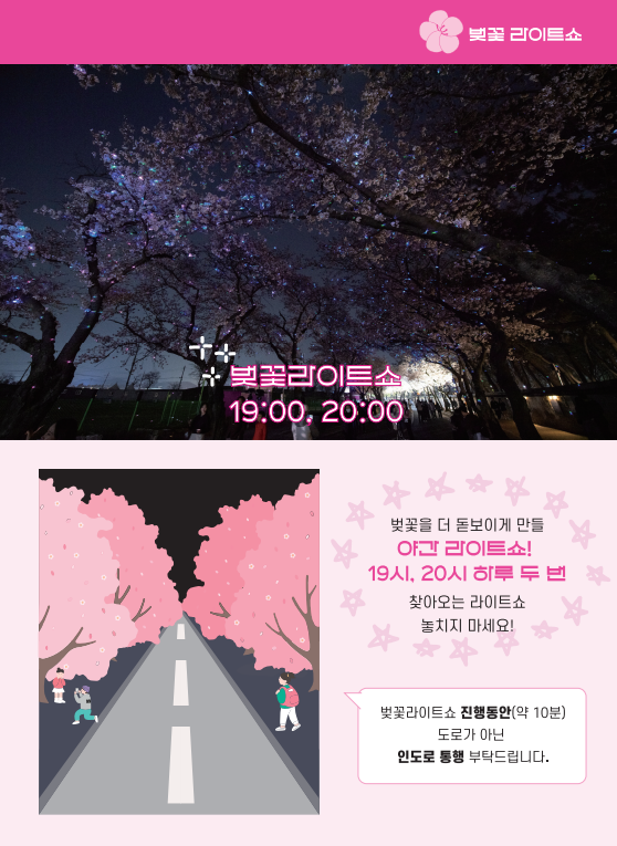 - 저녁7시부터는 벚꽃라이트쇼가 준비되어 있어 야간에 더욱 아름다운 벚꽃로드를 구경하실수 있습니다.