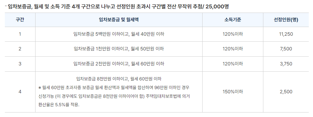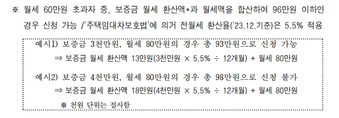 - 월세 60만 원 이하, 보증금 8천만 원 이하의 주택에 거주하는 경우 신청 가능합니다.