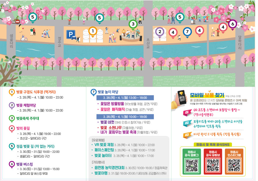 - 벚꽃 체험마당, 비눗방울 체험, 마술 체험 및 페이스페인팅, 벚꽃 네컷 등 가족과 친구, 연인이 즐길수 있는 다양한 프로그램이 준비되어 있습니다.