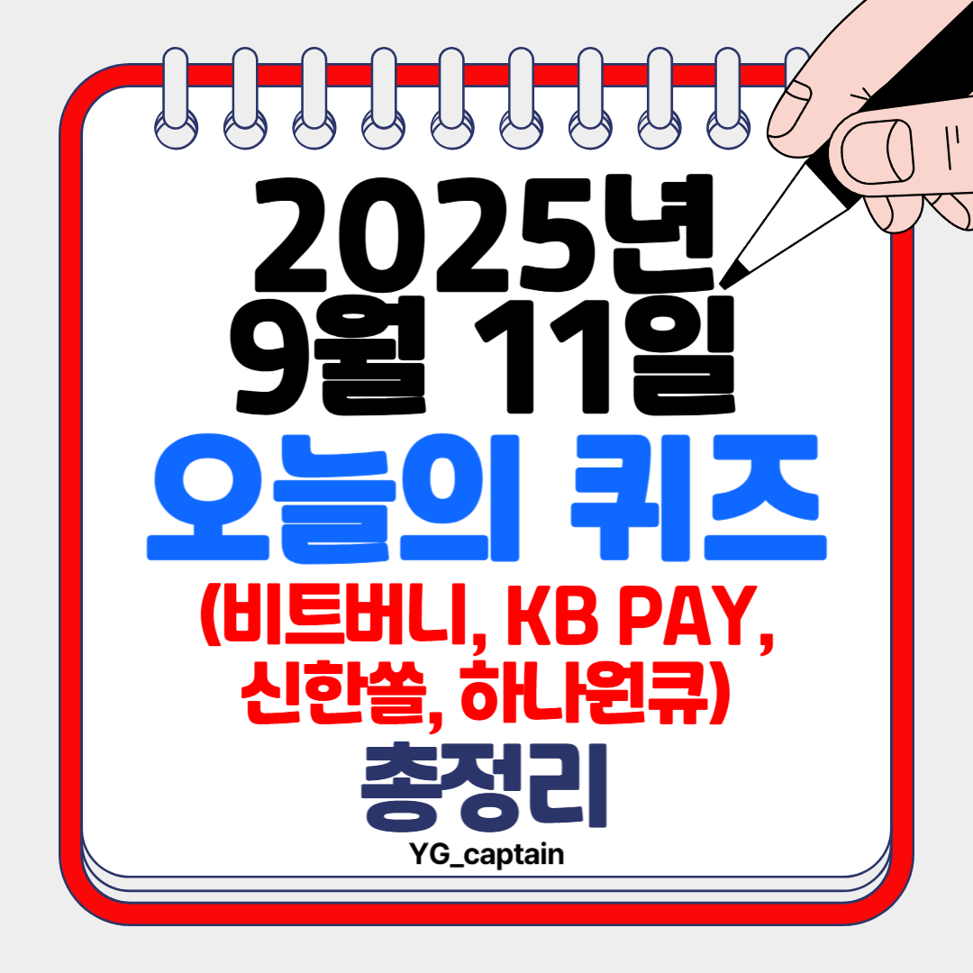 9월 11일 기준, 비트버니(상식퀴즈·OX퀴즈), KB Pay, 신한SOL(쏠퀴즈·퀴즈팡팡·슈퍼SOL 출석퀴즈) 문제와 정답을 모아봤어요.