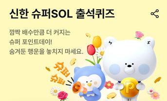 📌 참여방법 : 신한SOL 앱 실행 → 슈퍼SOL 출석퀴즈 메뉴 참여